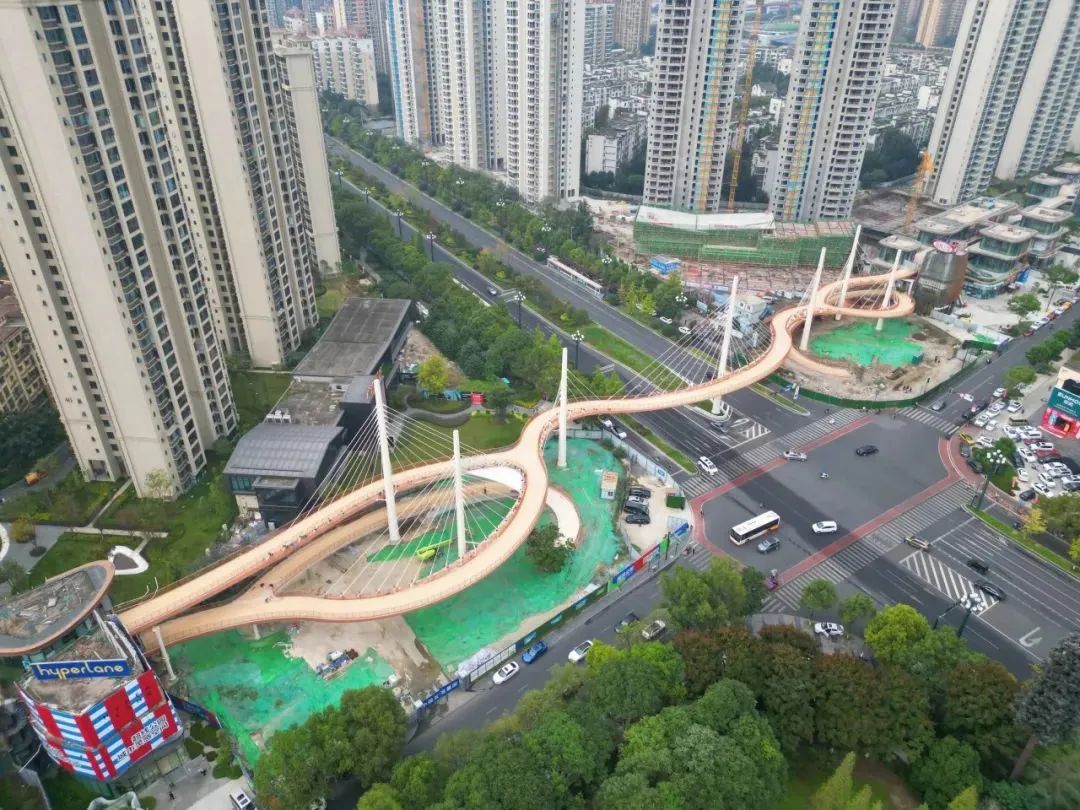 蜀龍路跨線橋主線全長249.6米,共包含7根索塔、100根鋼索以及24節段鋼箱梁。全橋采用鋼結構實現靈動造型,沒有一座橋墩,通過7根索塔拉起1000余噸橋體。