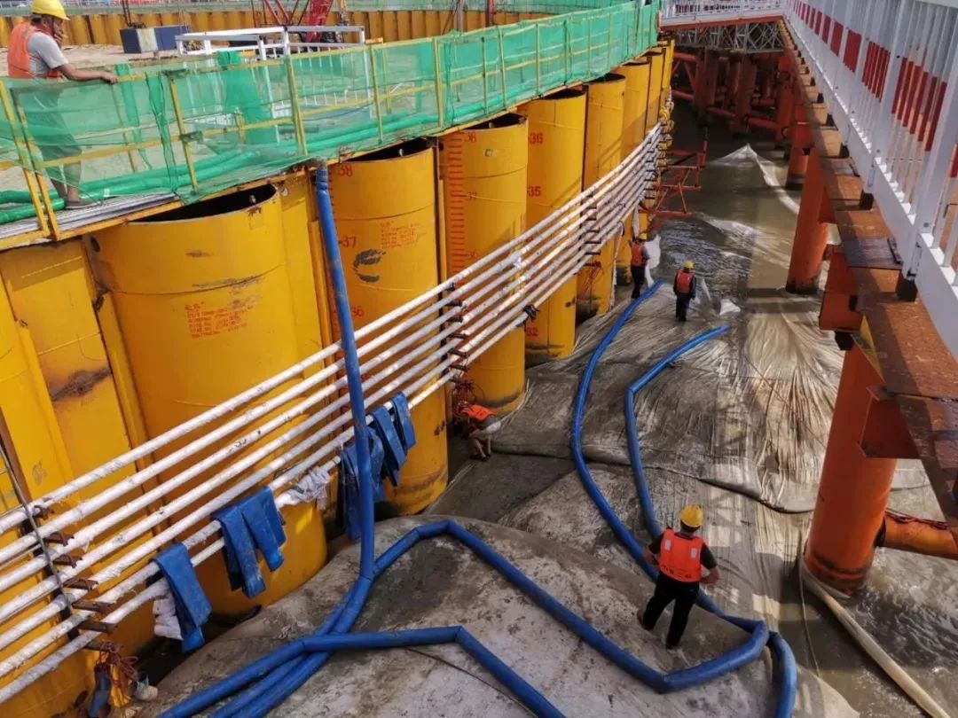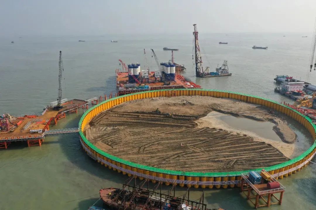 2017年9月18日,隨著最后一根鋼圓筒振沉到位,57個鋼圓筒,每個直徑28米、高35-40米,重達650噸全部精準牢固地打入海底巖層中。西人工島外圈圍堰如珠玉般勾勒出“海上鯤鵬”。僅用4個半月,在寬闊的伶仃洋中間,憑空筑起一座相當于19個足球場大小的人工島,刷新了快速成島的世界紀錄。