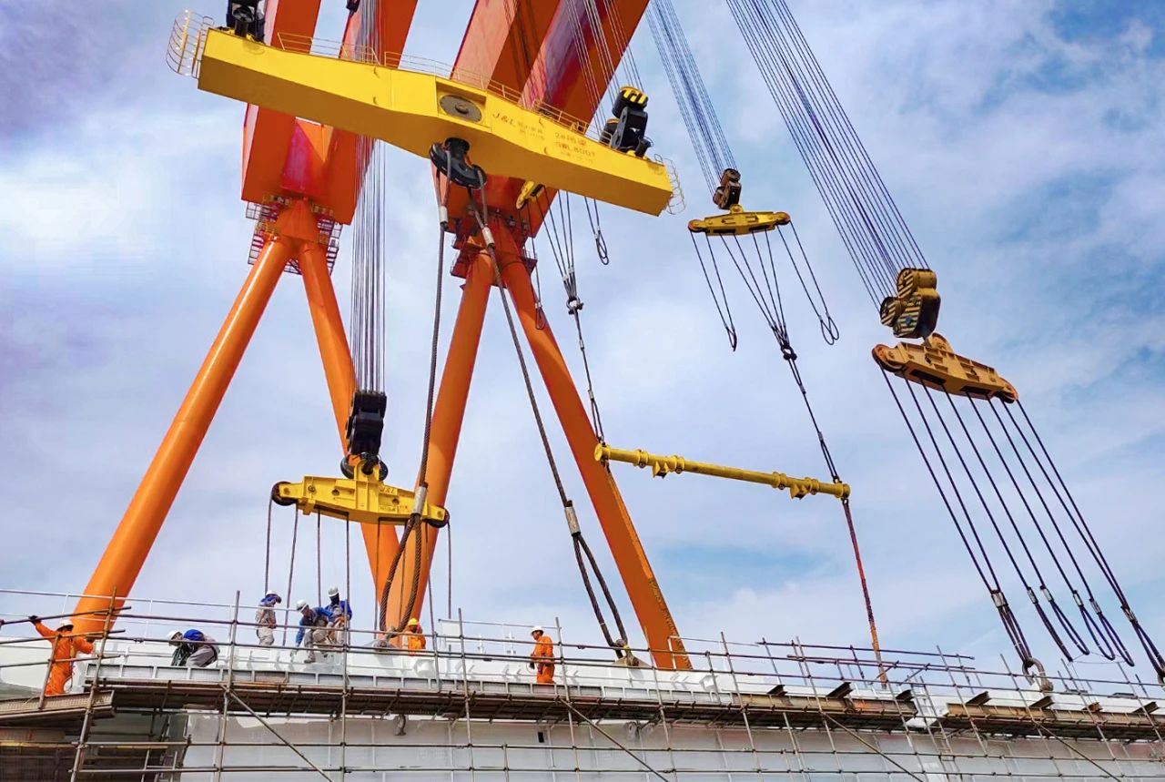 2023年12月,由我國自主設計建造的亞洲首艘圓筒型“海上油氣加工廠”“海洋石油122”浮式生產儲卸油裝置——“海葵一號”超級能源碗在青島完成主體建造,巨力索具提供800噸吊梁、400噸、500噸吊排及配套索具組成成套吊裝系統,全程配合吊裝順利進行。