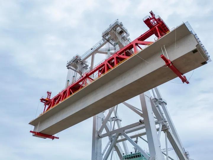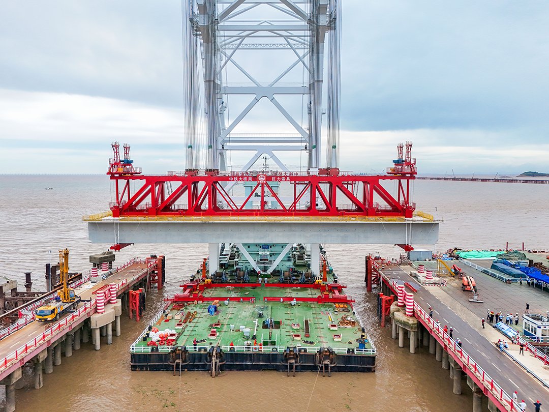 巨力索具生產制造的預制箱梁吊具與中鐵大橋局研制的“天一號”運架一體船協同作戰,采用“低平潮取梁、漲潮期運輸、平潮期落梁”的精準調度方案,克服了海域潮汐變化大、海上風浪干擾強、運輸距離長等諸多施工難題,將落梁誤差控制在毫米級,最終將這新一代“世界梁王”架設到位。